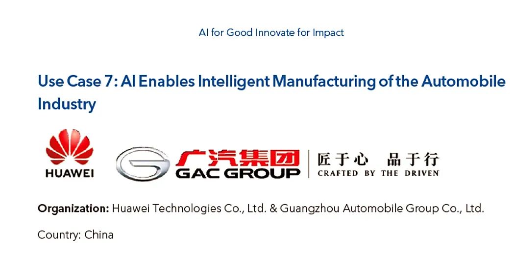 近日,由联合国国际电信联盟(International Telecommunication Union,以下简称ITU)携手47家联合国伙伴机构共同举办的2025人工智能向善全球峰会在瑞士日内瓦召开。峰会期间,ITU正式发布《人工智能向善:创新扩大影响案例集》(AI for Good - Innovate for Impact Report)2025年中期报告,其中,广汽集团联合华为公司共同打造的“AI赋能汽车行业智能制造”方案(以下简称广汽华为联合AI解决方案)成功入选。