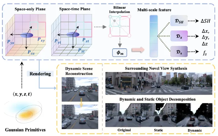 在自动驾驶领域,3DGS技术被广泛应用于高保真仿真场景的重建。通过将多视角图像转化为3D高斯点云,3DGS能够快速、精确地重建复杂的街道场景,为自动驾驶系统的训练和验证提供真实的虚拟环境。例如,Huang等人提出的S³Gaussian方法,通过自监督学习,从4D一致性中分解动态和静态元素,实现了高质量的街道场景重建。 此外,Zhou等人提出的DrivingGaussian方法,针对环视动态自动驾驶场景,发展了基于3D高斯的重建仿真技术。该方法能够有效建模复杂的多尺度背景和前景,提升了自动驾驶系统在复杂环境下的感知能力